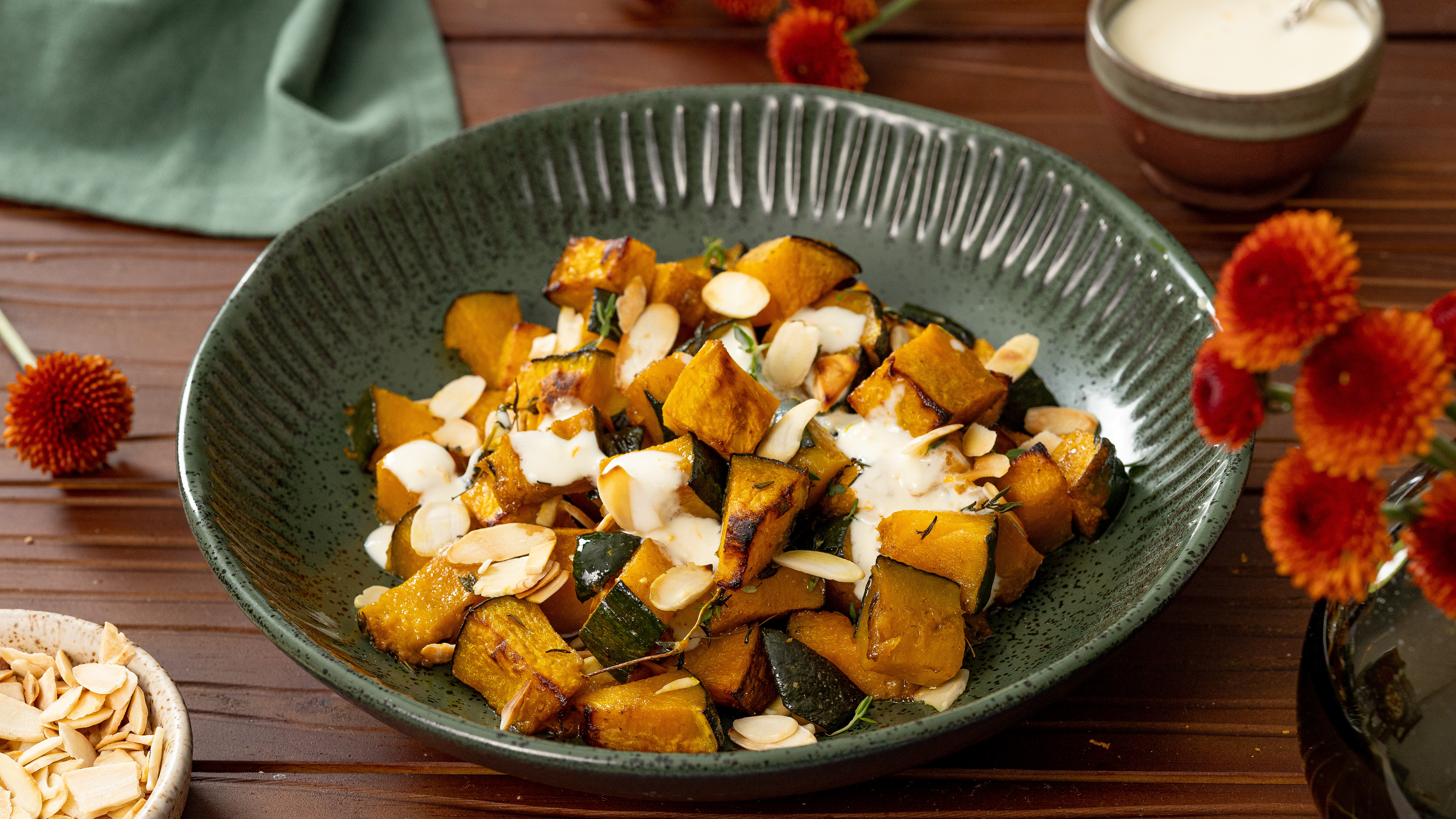 ABÓBORA ASSADA COM MOLHO DE IOGURTE E AMÊNDOAS